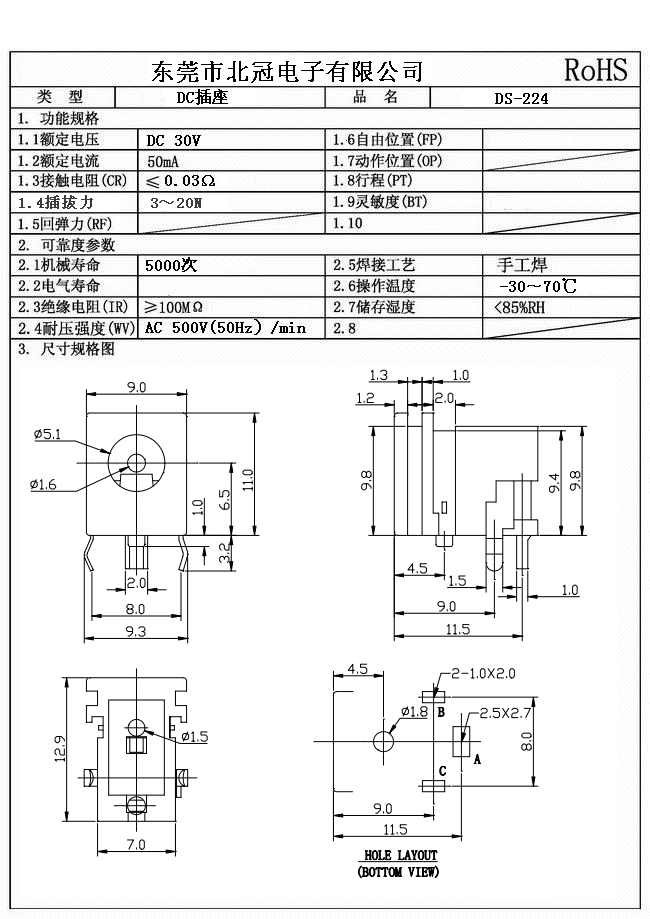 Typical Specifications 1. Rating : DC 30V 0.5A 2. Contact Resistance : 70ΩMax 3.Lnsulation Resistance: DC500V 1Minute 4.Operating Temperature Range: -25℃+80℃ 5.Ambient Humidity Used: ≤85%RH 6. Operating Force : 3-20N 7. Operating Life : 5,000Cycles