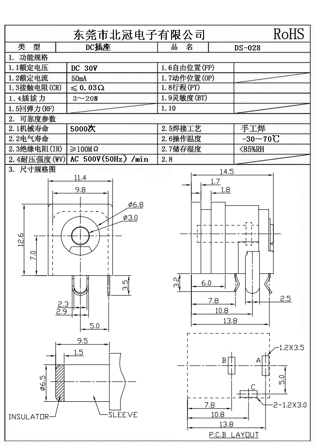Typical Specifications 1. Rating : DC 30V 0.5A 2. Contact Resistance : 70ΩMax 3.Lnsulation Resistance: DC500V 1Minute 4.Operating Temperature Range: -25℃+80℃ 5.Ambient Humidity Used: ≤85%RH 6. Operating Force : 3-20N 7. Operating Life : 5,000Cycles