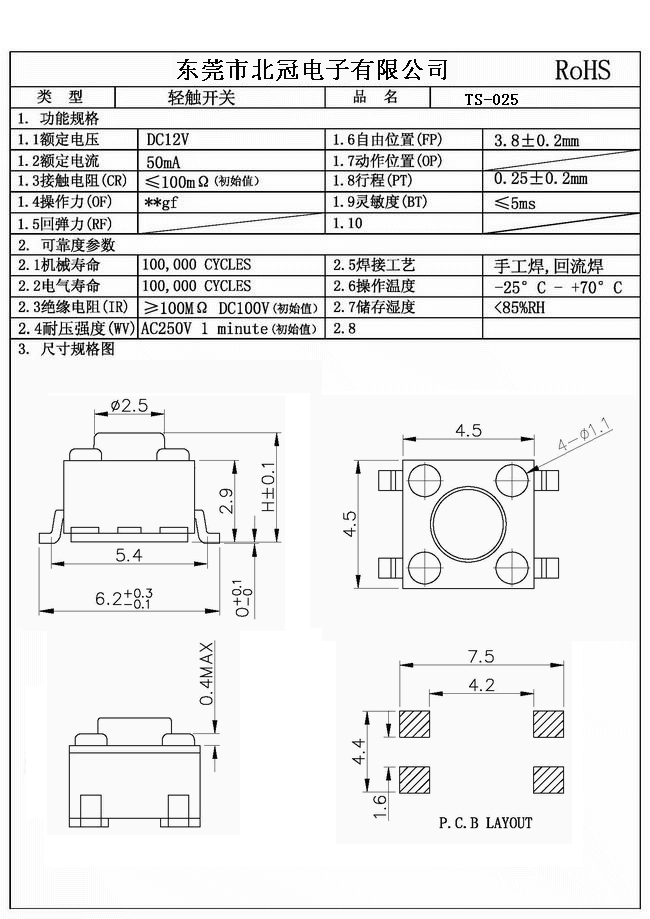 產(chǎn)品名稱:TS-025輕觸開(kāi)關(guān)