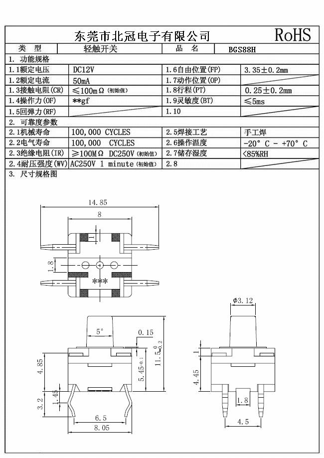 產(chǎn)品名稱:BGS88H輕觸開關(guān)