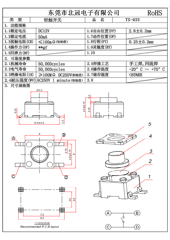 產(chǎn)品名稱:TS-033輕觸開關 Typical Specifications |