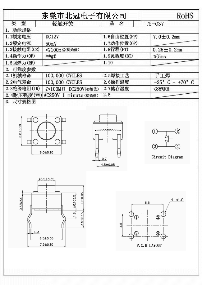 產(chǎn)品名稱:TS-037輕觸開關(guān) Typical Specifications |