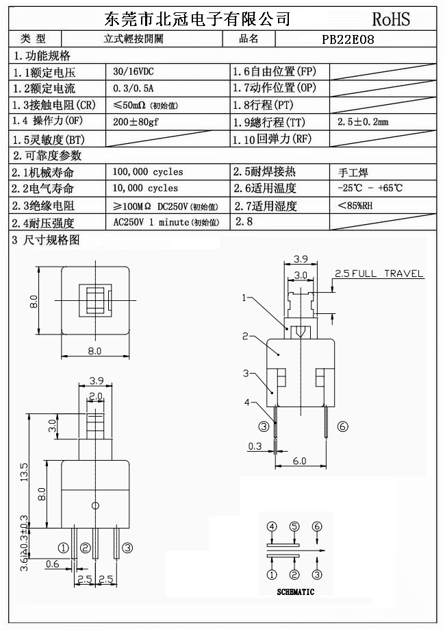 1.Rating : DC 30V 0.1A 2.Contact Resistance: ≤100mΩ 3.Lnsulation Resistance: ≥100mΩ DC500V 4.Operating Temperature Range: -25℃+80℃ 5.Ambient Humidity Used: ≤85%RH 6.Operating Force : 180 ± 50 gf 7.Mechanical Life : 10,000 Cycles 8.Solder Ability:260℃±5℃ 3s