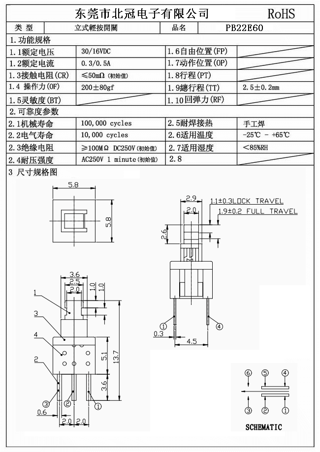 1.Rating : DC 30V 0.1A 2.Contact Resistance: ≤100mΩ 3.Lnsulation Resistance: ≥100mΩ DC500V 4.Operating Temperature Range: -25℃+80℃ 5.Ambient Humidity Used: ≤85%RH 6.Operating Force : 180 ± 50 gf< 1.