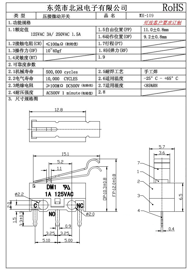 Typical Specifications 1.Rating : DC30V 0.1A 2.Contact Resistance: ≤100mΩ 3.Lnsulation Resistance: ≥100mΩ DC500V 4.Operating Temperature Range: -25℃+85℃ 5.Ambient Humidity Used: ≤85%RH 6.Mechanical Life: 100,000Cycles 7.Operating Force:30±10gf 8.OP:8.8±0.8mm 9.Order: AC 125V 3A