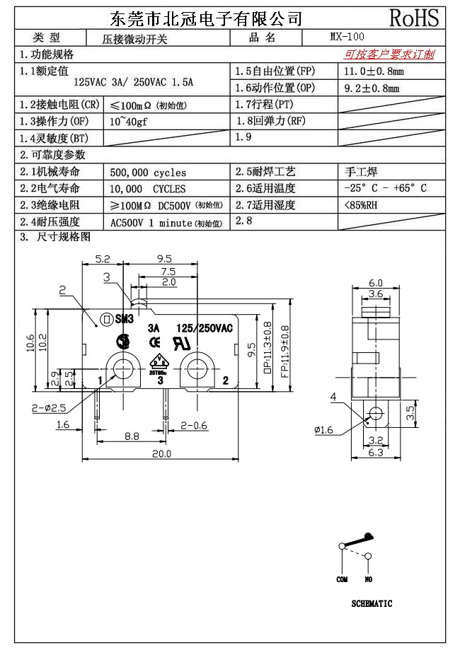 Typical Specifications 1.Rating : DC30V 0.1A 2.Contact Resistance: ≤100mΩ 3.Lnsulation Resistance: ≥100mΩ DC500V 4.Operating Temperature Range: -25℃+85℃ 5.Ambient Humidity Used: ≤85%RH 6.Mechanical Life: 100,000Cycles 7.Operating Force:30±10gf 8.OP:8.8±0.8mm 9.Order: AC 125V 3A