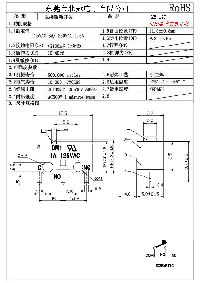 Typical Specifications 1.Rating : DC30V 0.1A 2.Contact Resistance: ≤100mΩ 3.Lnsulation Resistance: ≥100mΩ DC500V 4.Operating Temperature Range: -25℃+85℃ 5.Ambient Humidity Used: ≤85%RH 6.Mechanical Life: 100,000Cycles 7.Operating Force:30±10gf 8.OP:8.8±0.8mm 9.Order: AC 125V 3A