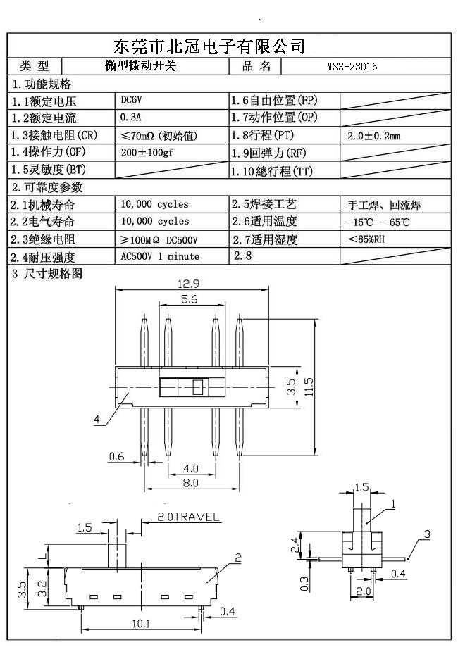 Typical Specifications 1. Rating : DC 12V 50mA 2. Contact Resistance :≤50mΩ 3.Lnsulation Resistance: DC500V 1Minute 4.Operating Temperature Range: -25℃+80℃ 5.Ambient Humidity Used: ≤85%RH 6. Operating Force : 200gf 7. Operating Life : 10,000Cycles