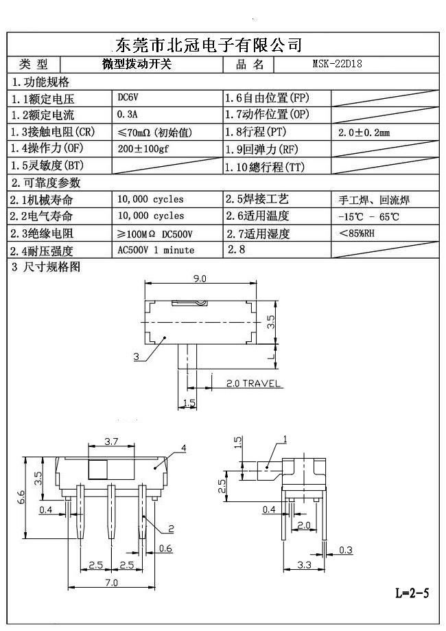 Typical Specifications 1. Rating : DC 12V 50mA 2. Contact Resistance :≤50mΩ 3.Lnsulation Resistance: DC500V 1Minute 4.Operating Temperature Range: -25℃+80℃ 5.Ambient Humidity Used: ≤85%RH 6. Operating Force : 200gf 7. Operating Life : 10,000Cycles
