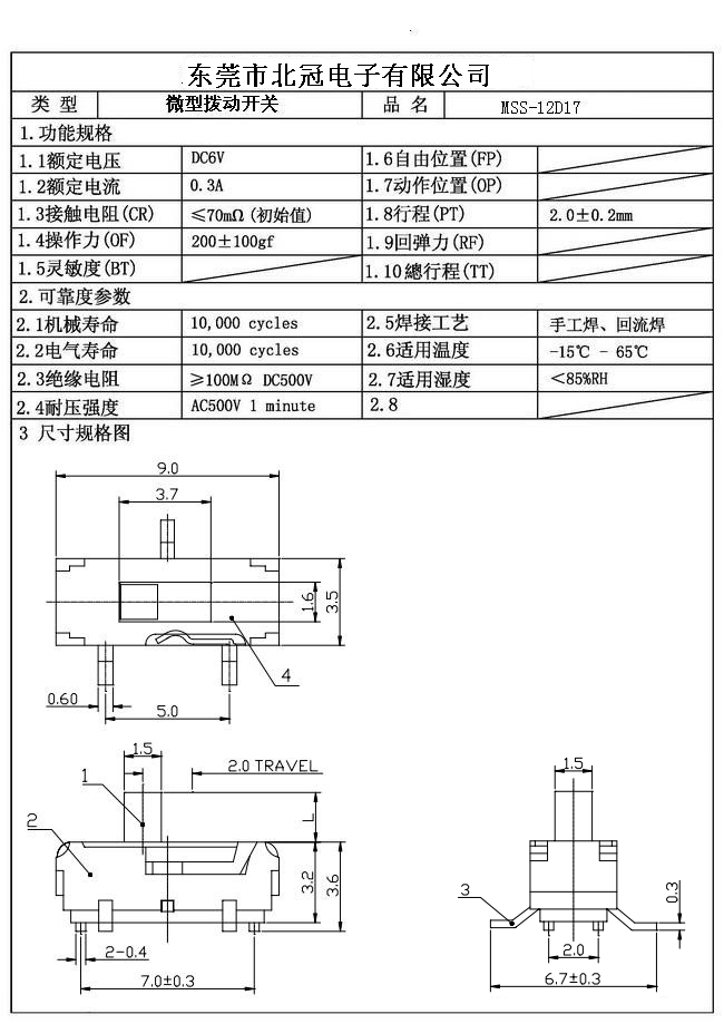 Typical Specifications 1. Rating : DC 12V 50mA 2. Contact Resistance :≤50mΩ 3.Lnsulation Resistance: DC500V 1Minute 4.Operating Temperature Range: -25℃+80℃ 5.Ambient Humidity Used: ≤85%RH 6. Operating Force : 200gf 7. Operating Life : 10,000Cycles