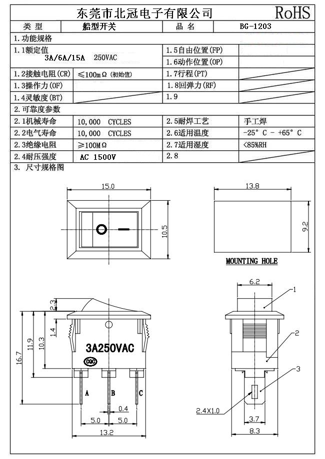 技術(shù)參數(shù)〔SPECIFICATION〕 額定電流、電壓: 6(4)A 250VAC 6A/125A 250VAC 6A 250VAC/10A 125VAC 接觸電阻:≤20mΩ 絕緣電阻:≥100MΩ 介電強(qiáng)度:≥1800VAC/3S 電器壽命:≥10000次