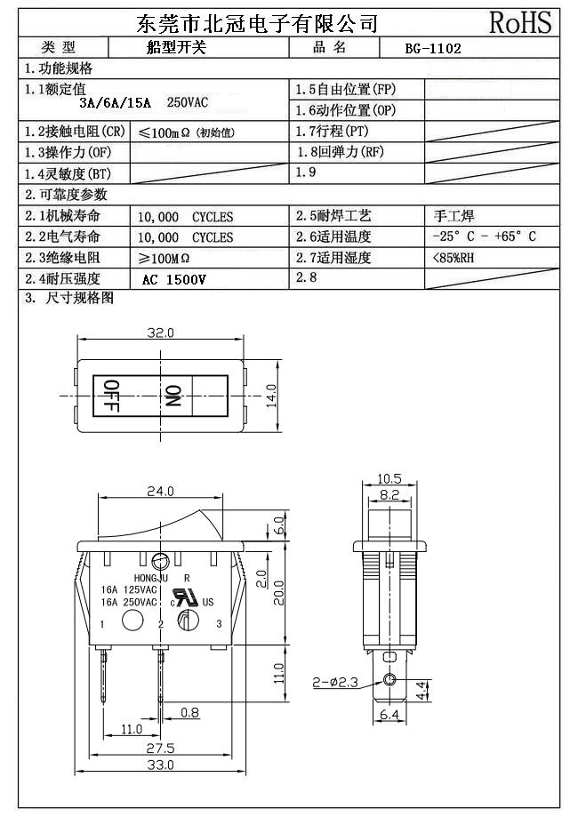 技術(shù)參數(shù)〔SPECIFICATION〕 額定電流、電壓: 6(4)A 250VAC 6A/125A 250VAC 6A 250VAC/10A 125VAC 接觸電阻:≤20mΩ 絕緣電阻:≥100MΩ 介電強(qiáng)度:≥1800VAC/3S 電器壽命:≥10000次